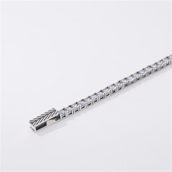 Bracciale tennis in argento 925 rodiato e zirconi. Zirconi bianchi incassati a griffe. Chiusura pinza a molla. Misura cm 19.