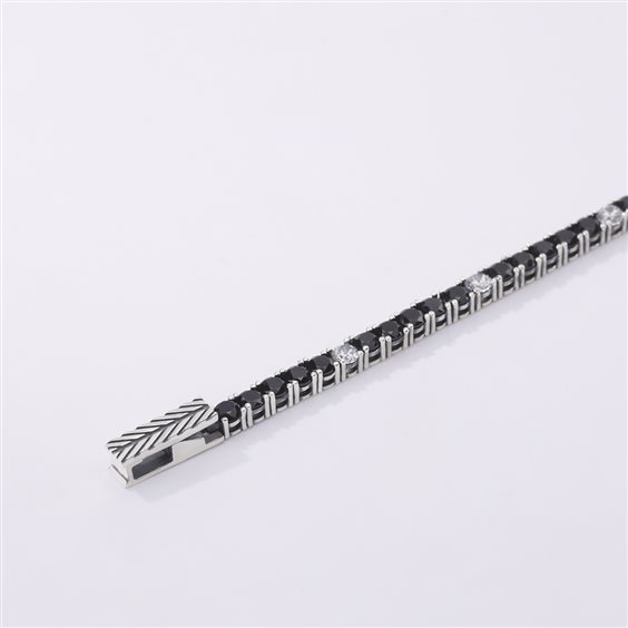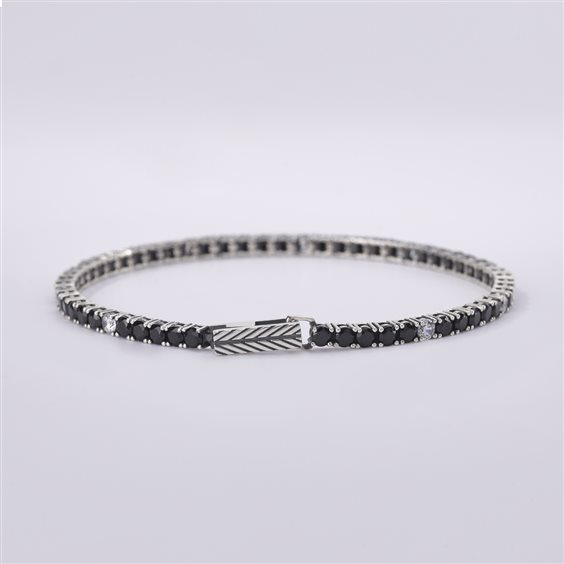 Bracciale tennis in argento brunito con zirconi neri e bianchi. • Incastonatura degli zirconi con griffe a quattro punte • Diametro degli zirconi: 3 mm • Chiusura a pinza con molla con texture spigata • misura medium, lunghezza 20 cm • Materiale: Argento 925, Zirconi