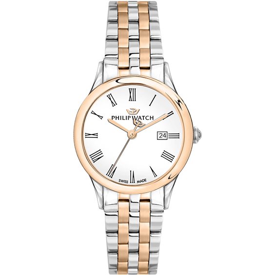 Orologio donna in acciaio 316L , movimento al quarzo swiss made , solo tempo , cassa mm 31 , quadrante bianco con numeri romani neri , datario , vetro zaffiro , fondello a pressione , finiture in oro rosè , cinturino regolabile , chiusura a farfalla con pulsanti. Garanzia e scatola originali , la confezione può variare di forma e colore.