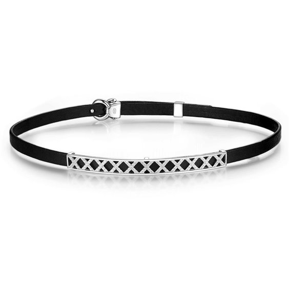 Collana Da Donna Di Rosato Della Collezione Sogni. Collana Girocollo In Pelle Nera Con Centrale In Argento 925 Intreccio Rosato Con Pave' Di Zirconi Bianchi E Fibbia In Argento Con Pave' Di Zirconi Bianchi. La Lunghezza Del Gioiello È Di 375 Mm E Il Peso È Di 6,5 Grammi.