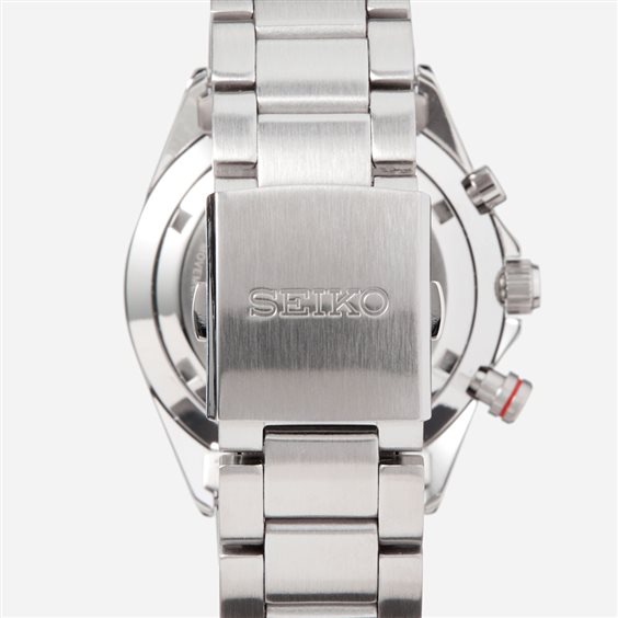 Questo orologio al quarzo della collezione Seiko SPORT è ricco di funzioni. Il suo quadrante blu profondo presenta i tre contatori del cronografo ed è circondato da una lunetta tachimetrica. Questo modello interamente in acciaio inossidabile è anche molto solido con il suo vetro hardlex, il suo fondello a vite e la sua resistenza all'acqua fino a 100 metri.